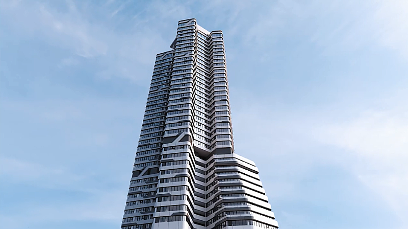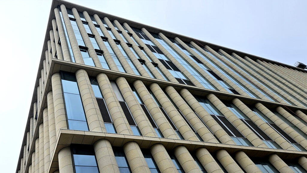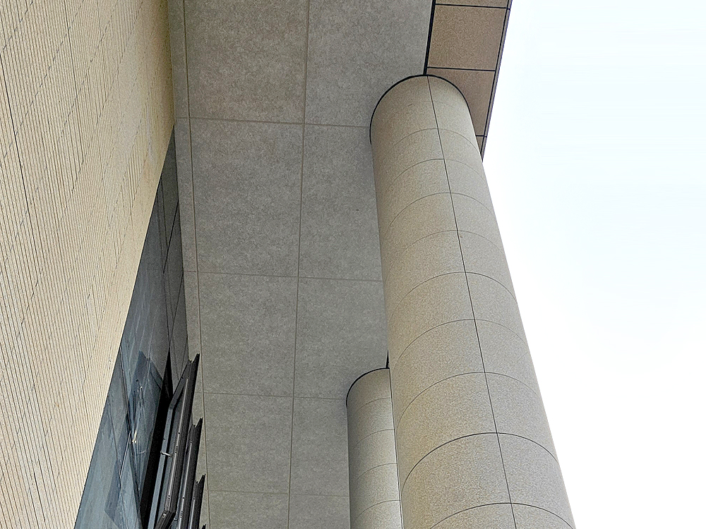 바닷가 앞의 38층 고층건물의 외장재, 태풍과 폭우에도 안전한 마감재 시공을 위해서는 구조계산서는 필수입니다 지역과 풍향을 고려하여 두께와 강도를 계산한 브라켓을 시공하여 진행합니다