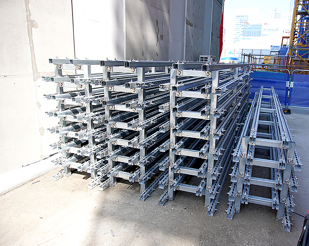 일반적인 하지 철물 시공 공법은 원자재가 현장에서 주어진 상태에서 진행되며 수직재 , 수평재를 재단하고 용접하여 고정한 후 용접면의 녹 방지를 처리하여 마감하는 형태로서 제한된 환경에서 모든 작업을 진행하기 때문에 속도가 늦어지며 많은 장비를 현장 내에서 준비하여야 합니다